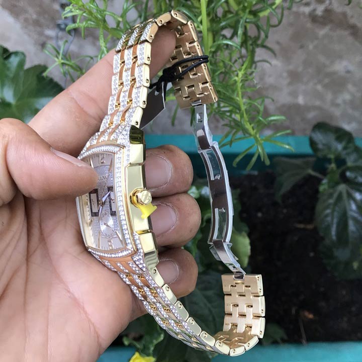 With 358 individually hand-set clear crystals, an oversized rectangular dial and a two-tone stainless steel case and bracelet, this striking Bulova men's dress watch projects style. Powered by a quartz movement, the dial showcases distinctive day, date and 24-hour subdials behind a curved crystal. Featuring a durable screw-back case, this Bulova Crystal Collection watch is water-resistant to 30 meters. Please note: Due to a recent redesign by Bulova, the watch you receive may not feature the Bulova tuning fork logo on the watch face.