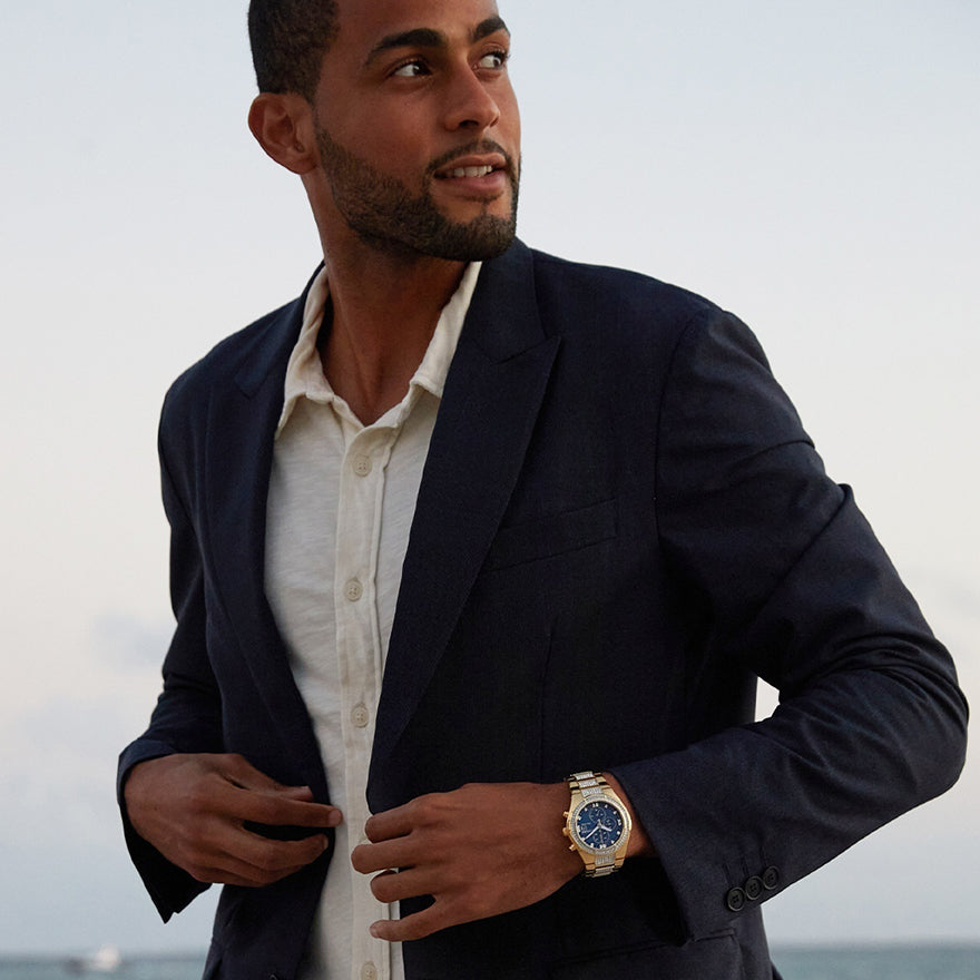 Gold stainless steel. Adorned with 318 Swarovski © crystals on the bezel, blue dial and bracelet, six-hand multifunction movement, luminous hands and markers, mineral glass, gold-tone stainless steel bracelet with deployant closure and 30 meter water resistance.