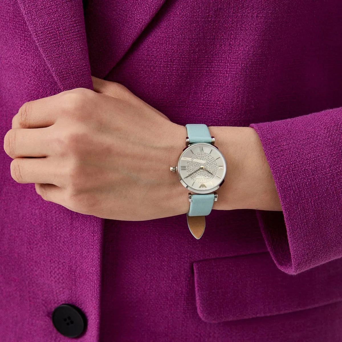 Emporio Armani Gianni T Bar Analog Crystals Silver Dial Blue Leather Strap Watch For Women - AR11443