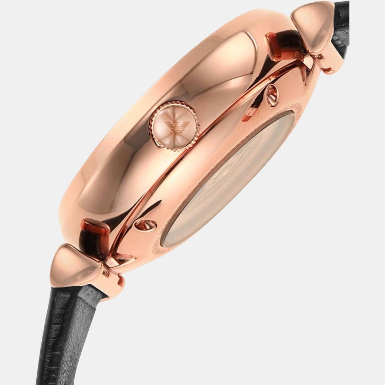 Emporio Armani women's automatic watch. Clock with round case of 34 mm made of stainless steel of rose gold color, with glossy finish. The thickness is 11 mm. The glass is transparent. The dial is mother of pearl. The distance of the anse is 14 mm. There are crystals on the dial. The strap is in black pro-planet leather with a shiny finish.