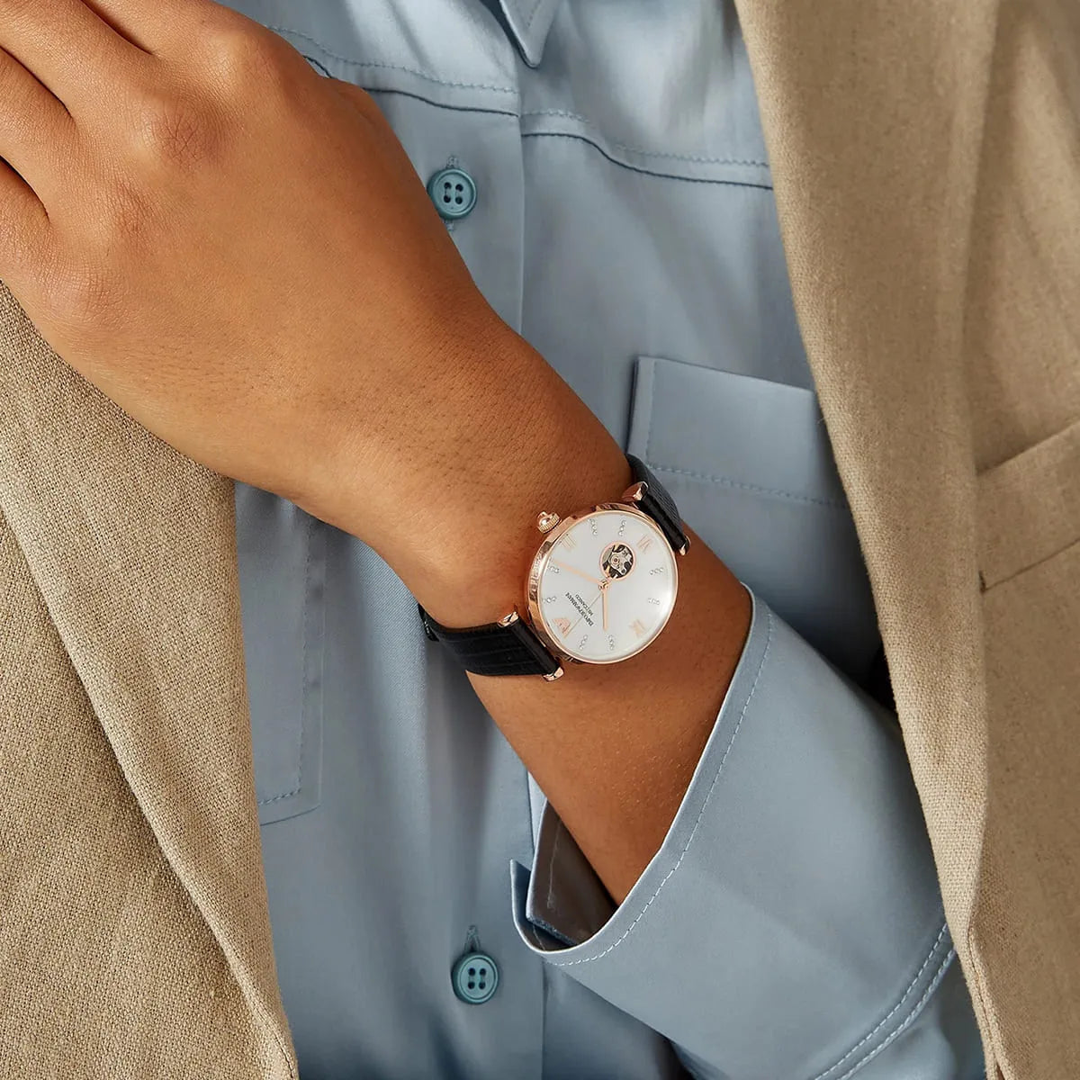 Defined by modern femininity, this Emporio Armani watch collection features T-bar watch styles with finishes that shine and glitz that shimmers. Available in a variety of sizes, shapes and colors and made from materials like genuine leather and stainless steel, each design is unique and made to complement your best looks. With protective qualities including scratch-resistant mineral crystal and water resistance, it’s a silhouette that’s easy to wear with looks that are hard to ignore.