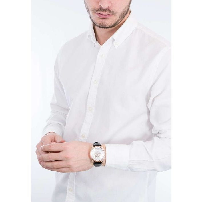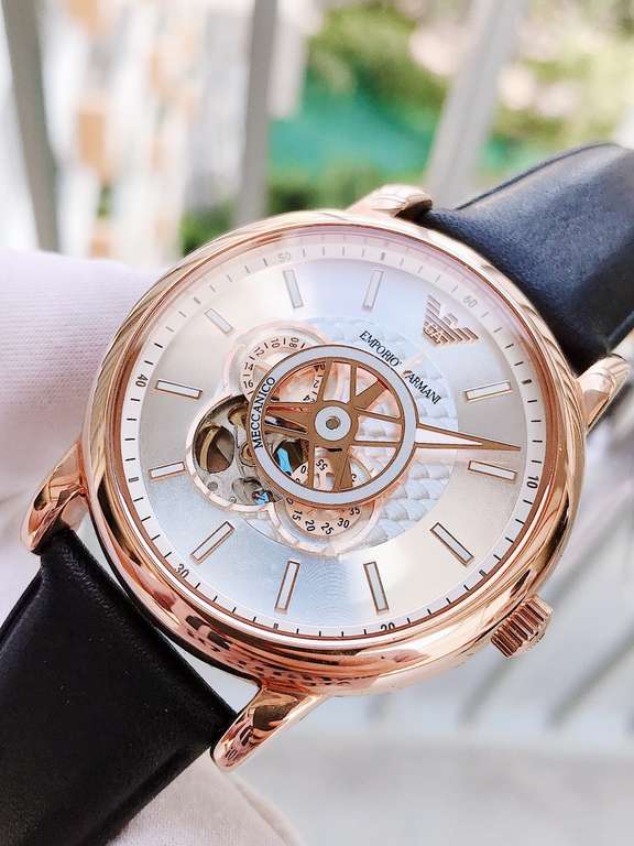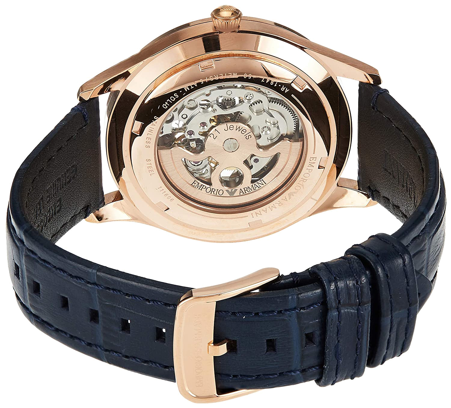 Silver (Skeleton Window) dial enhanced by luminous rose gold-tone hands. Rose Gold-tone stainless steel case with a black leather band. Automatic movement. 50 meters / 165 feet water resistance. Fixed bezel. Scratch Resistant Mineral crystal. Transparent caseback. Tang clasp. Pull / Push crown. Case size 43 mm x 12 mm. Band 20 mm x long. Emporio Armani AR60013 Luigi Watch.
