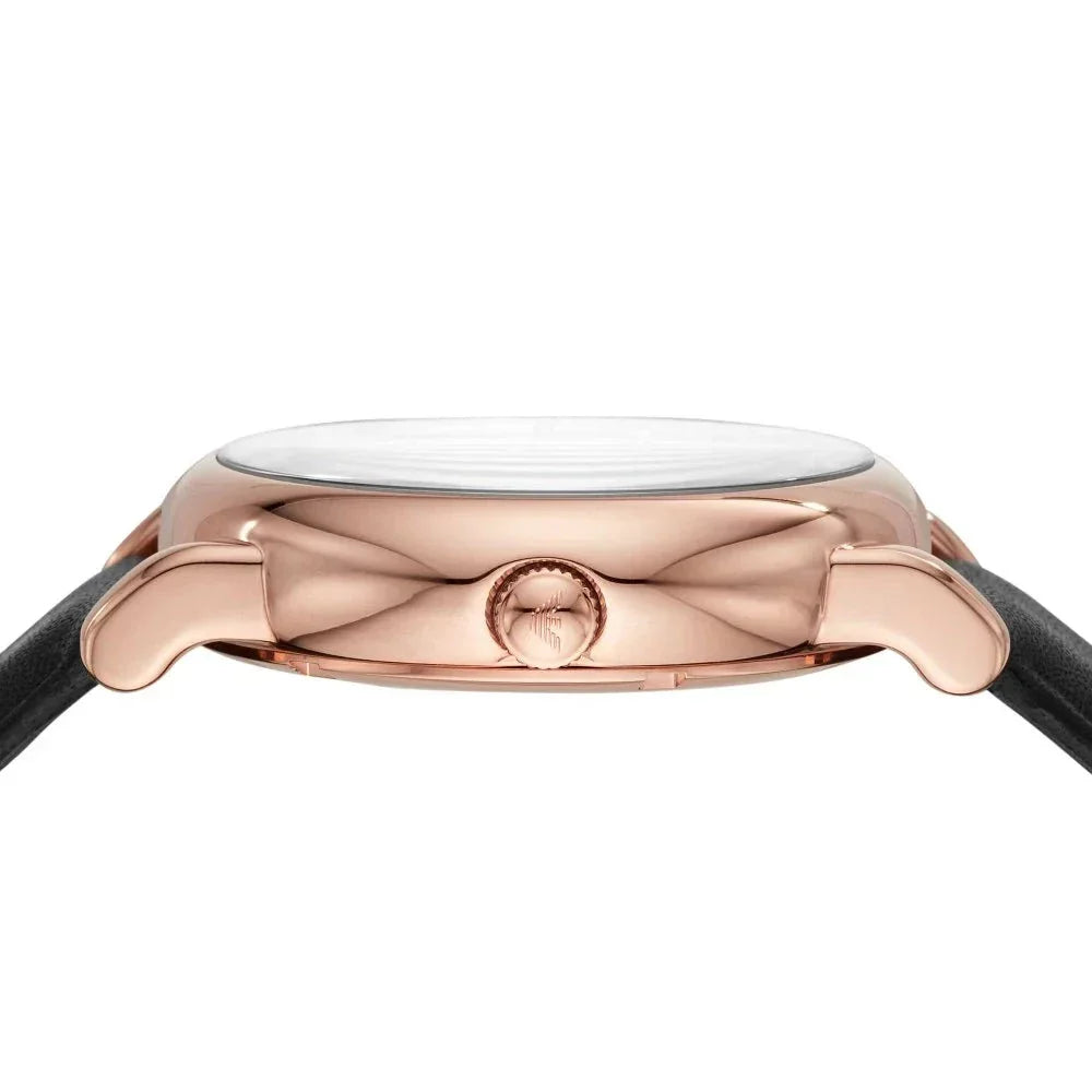 Elegant men's Emporio Armani AR60013 automatic watch in black and rose gold, featuring a round rose gold PVD stainless steel case. This stylish Emporio Armani watch has a clear to see silver dial which contrasts perfectly with the rose gold baton hour markers. The watch is powered by a quality automatic movement and fastens with a black genuine leather strap.