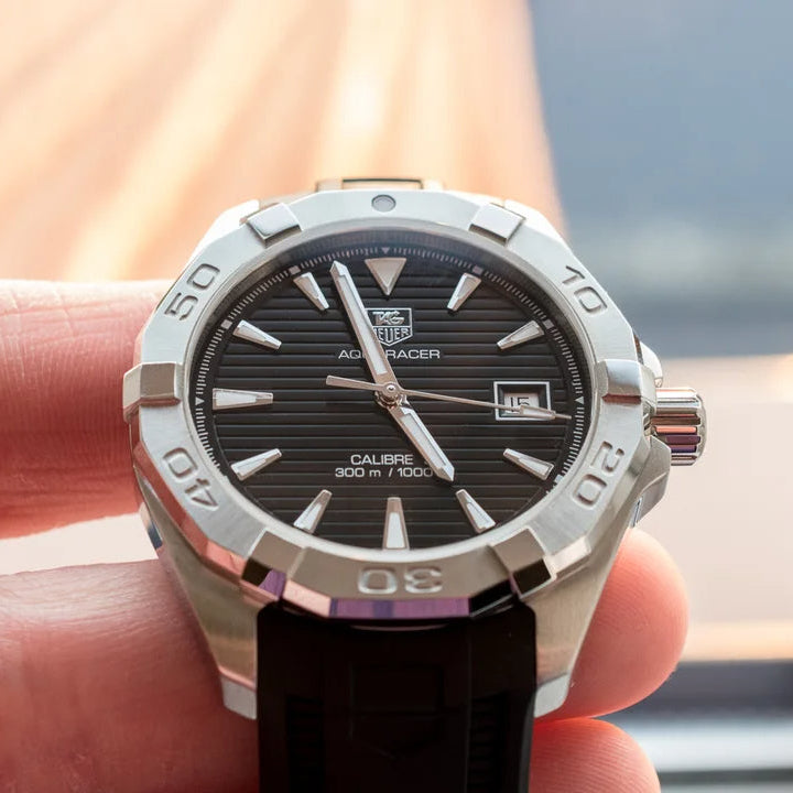 Expertly crafted for the modern man, the Tag Heuer Aquaracer Automatic Caliber 5 watch features a sleek black dial, black rubber strap, and a durable automatic movement. With its water-resistant design and elegant style, this watch is the perfect companion for any adventure.