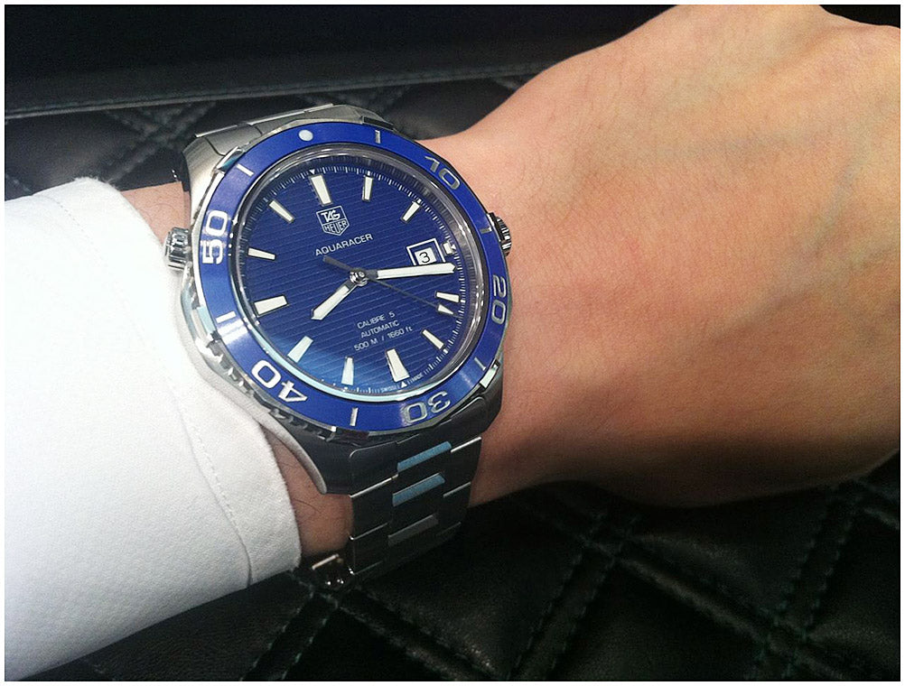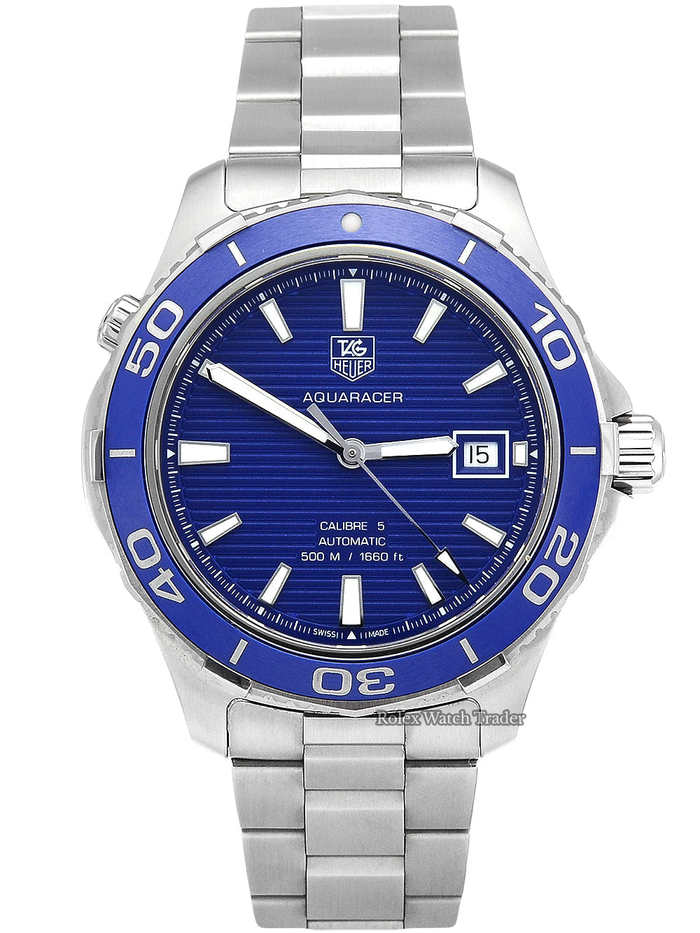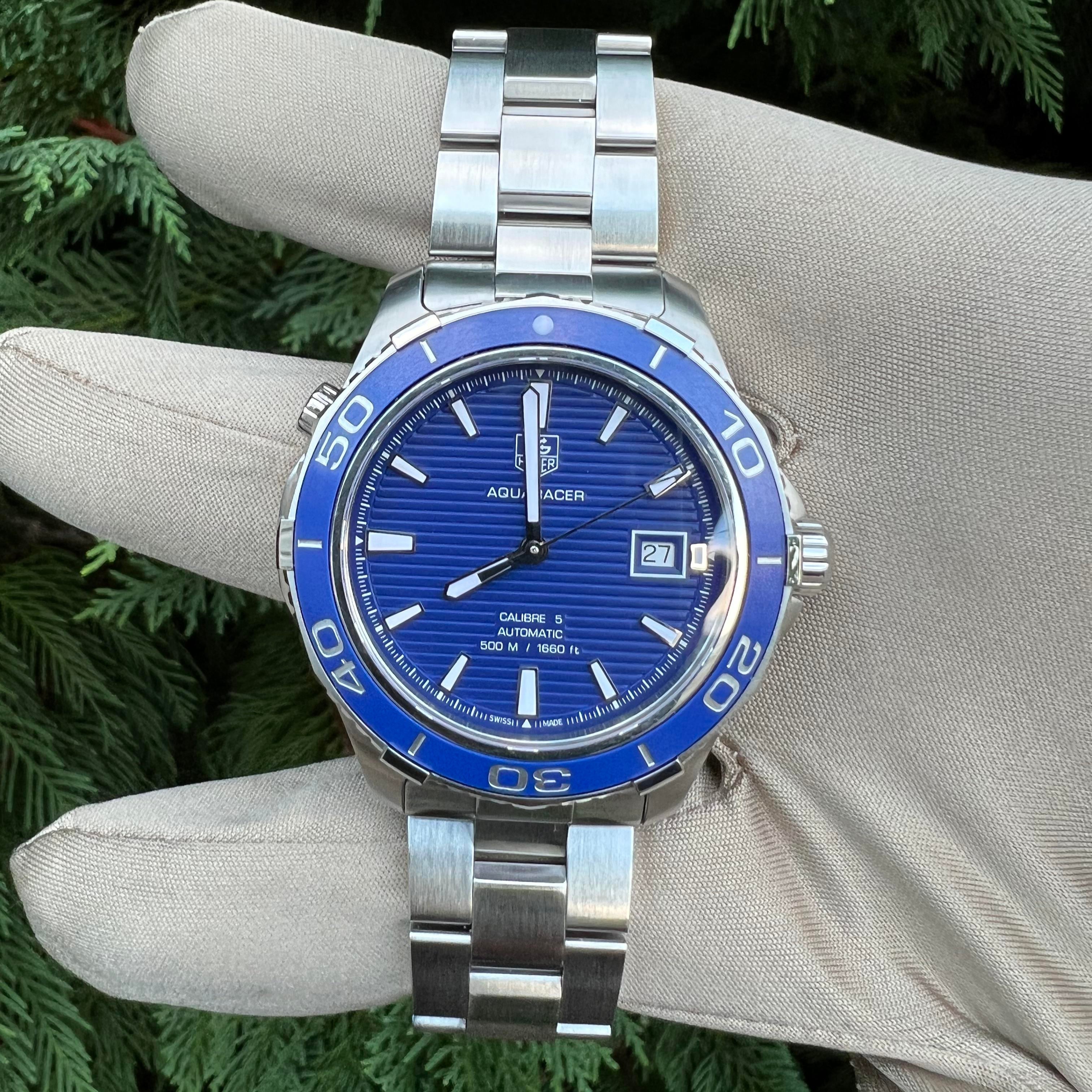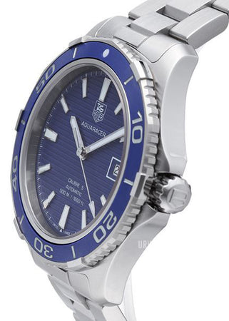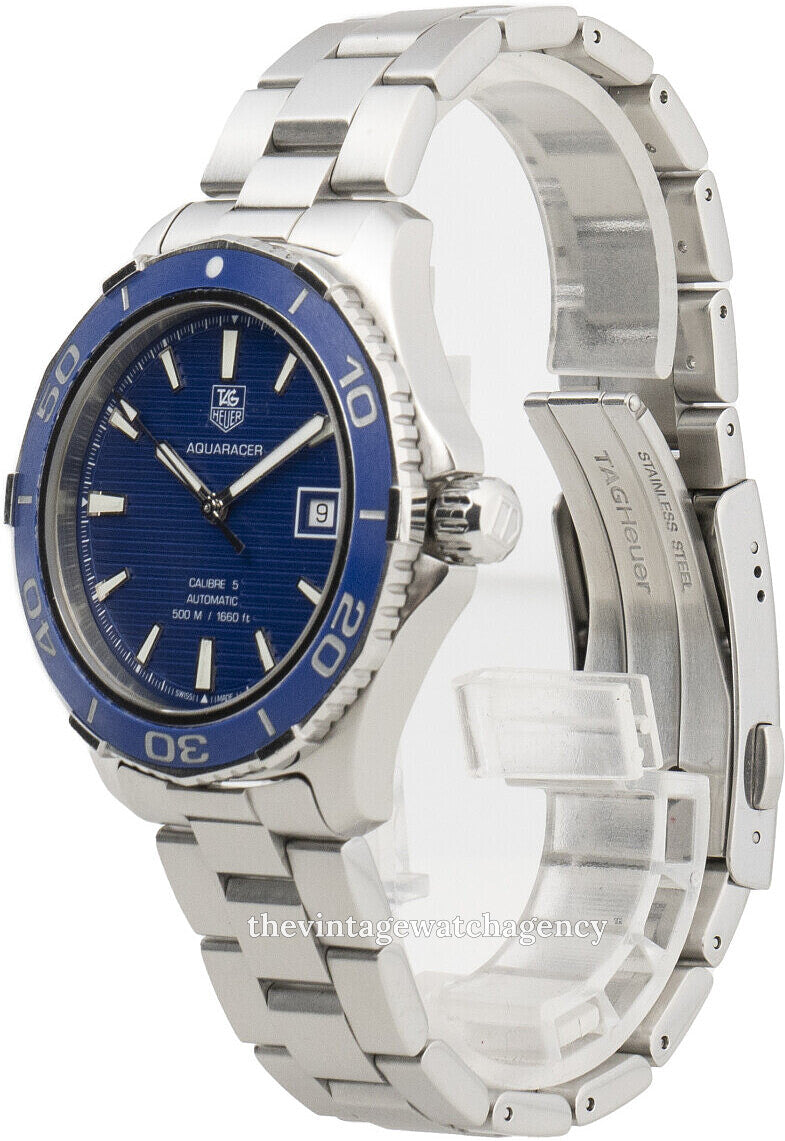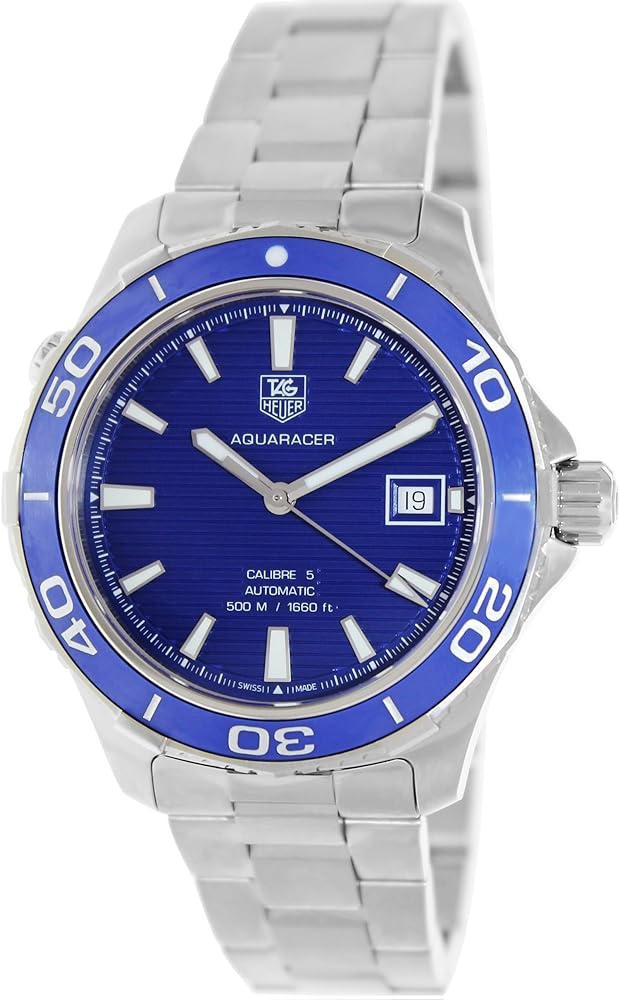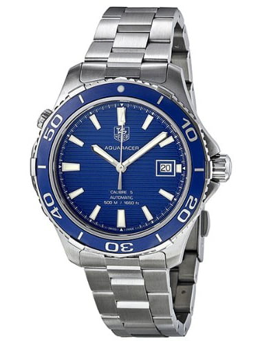 Screw down crown. Solid case back. Case diameter: 41 mm. Case thickness: 13 mm. Round case shape. Band width: 20 mm. Deployment clasp. Water resistant at 500 meters / 1650 feet. Functions: date, hour, minute, second. Luxury watch style. Watch label: Swiss Made. Tag Heuer Aquaracer Calibre 5 Blue Dial Stainless Steel Automatic Men's Watch WAK2111.BA0830.