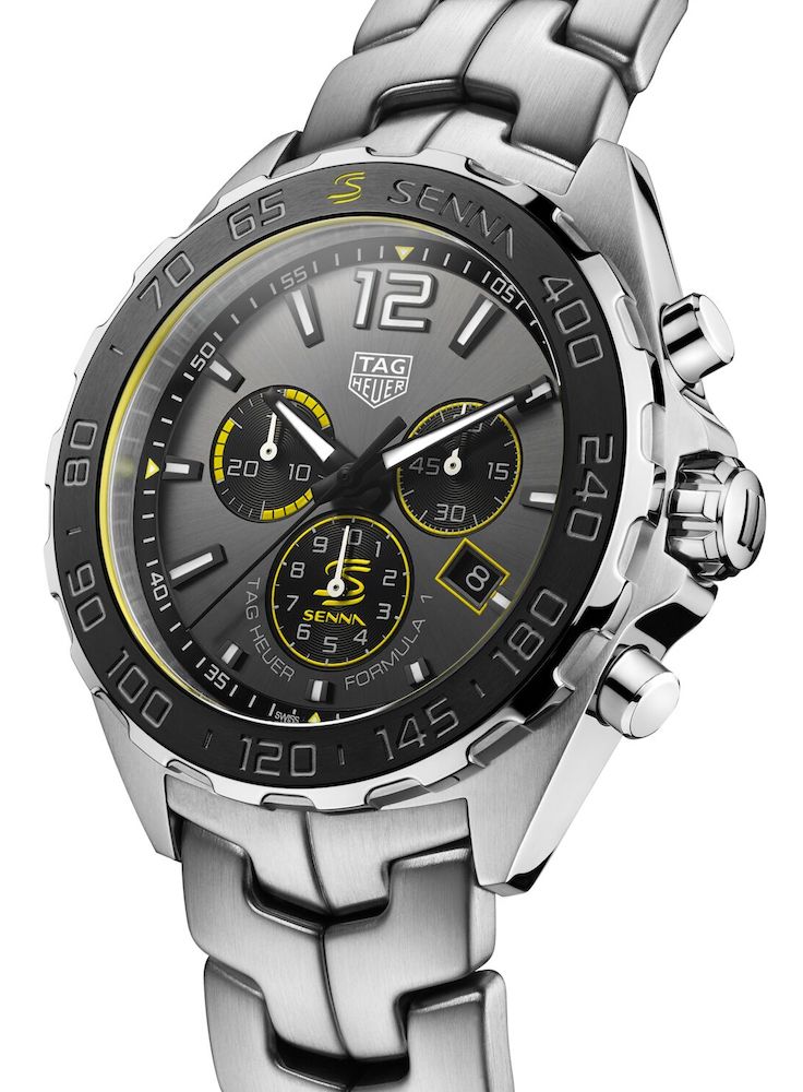 With a sleek 43mm stainless steel body and ceramic fixed bezel, this TAG Heuer Formula 1 watch provides an elegant aesthetic just like that of the race car driver that inspired it. The striking anthracite grey sunray dial is beautifully detailed with Superluminova coated hour and minute hands, three black and yellow subsidiary counters and a date window at 4 o’ clock. Each of these handy functions are powered by a Swiss quartz movement which is kept hidden behind a circular screw-in case back decorated with a special Senna engraving inspired by the Formula 1 race track. To complete the look of this TAG Heuer Formula 1 Ayrton Senna watch, a stylish fine-brushed bracelet is added alongside a folding clasp fitted with a special extension especially designed to fit over a racing suit.